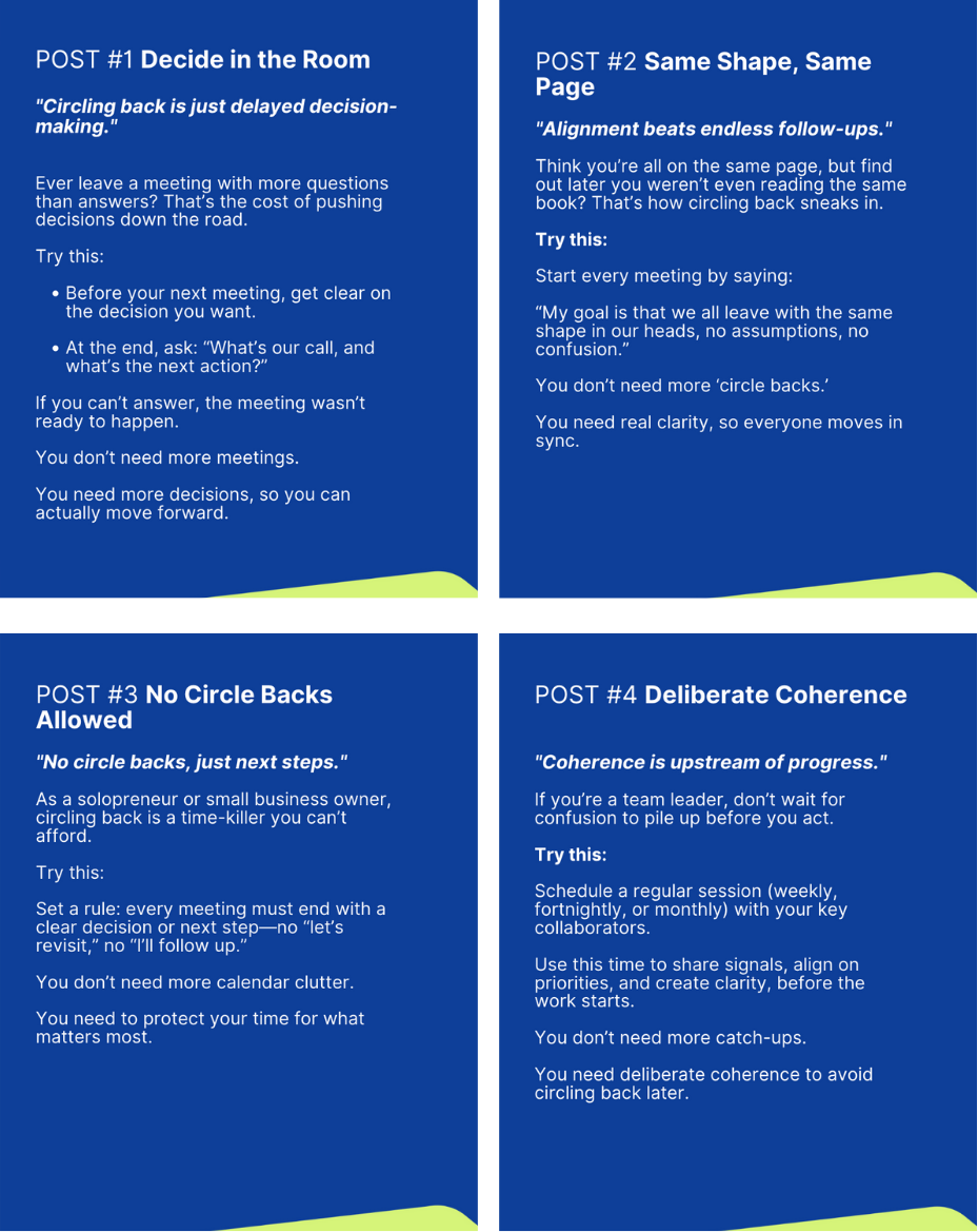 In this episode, we expose how “circling back” has become workplace kryptonite - killing momentum and stealing joy from our work. We unpack why this phrase signals deeper organisational dysfunction, share Amazon’s six-page memo approach, and offer three powerful post-it note strategies to eliminate endless loops and create real coherence in your team.